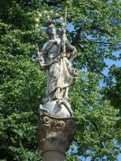 podnož s oblačnou základnou, na ní postava světce v životní velikosti v