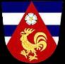 pětilistá květina na stonku, nad ní kohout a po obvodu popis majuskulou
