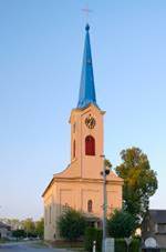 a dřevěné zvonice. Stavba byla zahájena v roce 1877 a dokončena až roku 1918. Hřbitov s ústředním křížem a hřbitovní bránou
