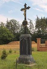 je obehnán železným zábradlím a znázorňuje kalvárii se sochami P. Marie a